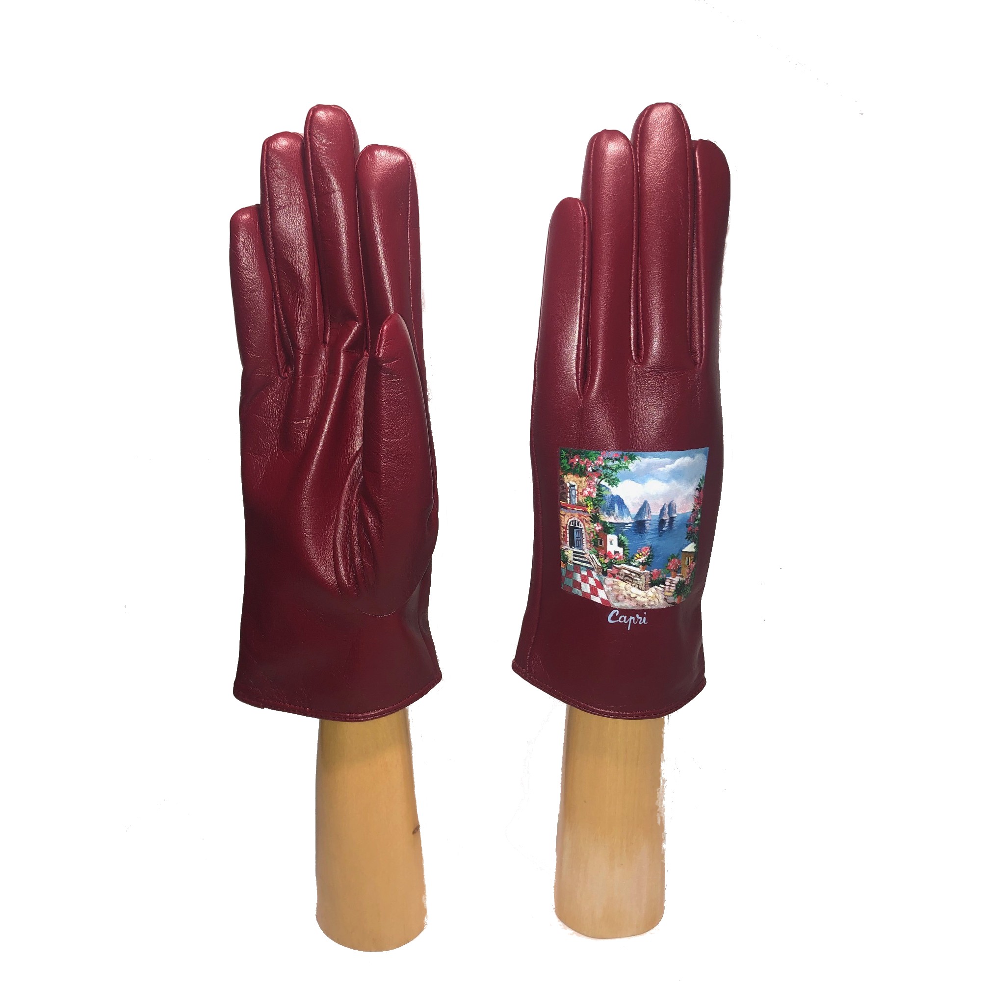 guanti in pelle nappa soft con motivo Faraglioni di Capri , dipinto a mano con colori ad olio . Foderati in cashmere . Colore Rosso